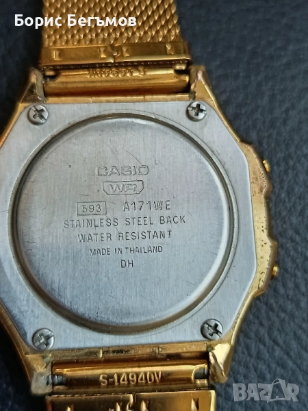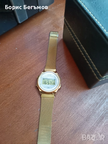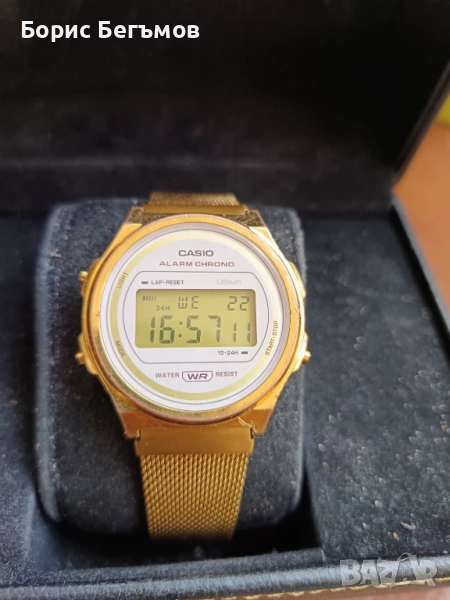 Това е унисекс дигитален часовник Casio Vintage A171WEMG-9AEF със златист кръгъл корпус и мрежеста каишка от неръждаема стомана.Работи точно.Пращаме със спиди или еконт с преглед и тест след превод на капаро за куриерската услуга, поради зачестили некоректни потребители или най-добре- лично предаване.