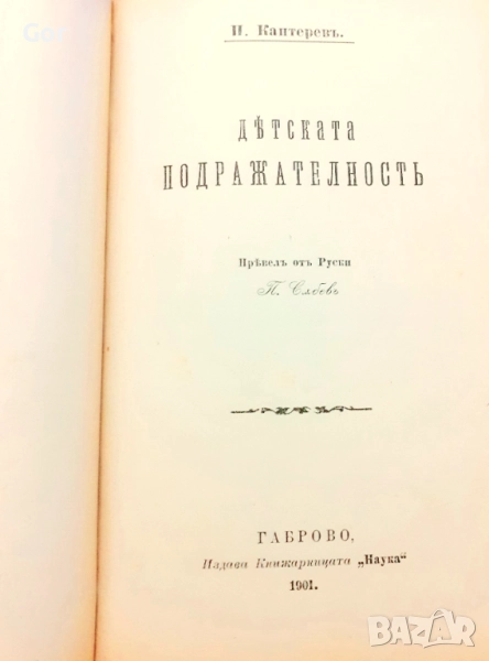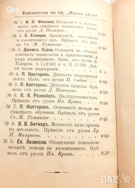 Оригинално издание на стар български правопис, издадено от Книжарница "Наука" – Габрово, 1903 г. Теми: възпитание, психология, педагогика. Съдържа 9 преведени от руски заглавия: