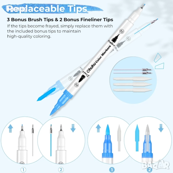 - ✎ Двоен връх, двойна креативност: комплектът химикалки Ohuhu е задължителен за следващия ви шедьовър. 0,4 мм фин връх на химикалките за оцветяване се плъзга през детайлите с течна прецизност за сложно оцветяване, писане и рисуване, докато 1-2 мм връх с мека четка на химикалките за оцветяване преминава през мащабните арт проекти за засенчване, оцветяване, смесване и създаване на интересни модели за вашия дневник.