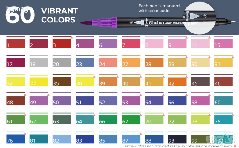 - ✎ Какво получавате: всяка поръчка на комплекта флумастери Ohuhu с 60 цвята включва 3 резервни върхове на четка, 2 фини върха и предварително отпечатана цветна примерна карта за ваше удобство. В допълнение към изящната и деликатна опаковка, този комплект химикалки за оцветяване е перфектен подарък за рождени дни, Коледа, Свети Валентин, подготовка за училище и др.