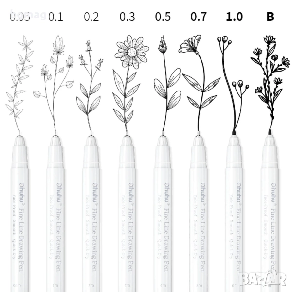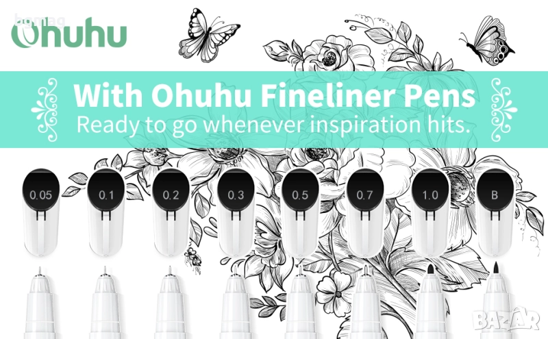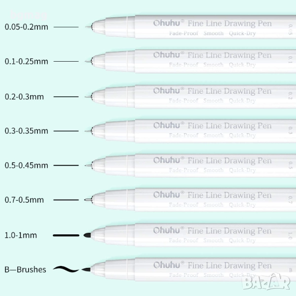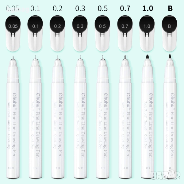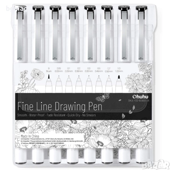 Ohuhu писалки/химикалки тънкописци, в черен цвят 8 бр. /размера/дебелини - 0.05mm, 0.1mm, 0.2mm, 0.3mm, 0.5mm, 0.7mm, 1.0mm и 1 бр. тип "четка" (brush tip pen), течно мастило, ролкова химикалка, гладка бързосъхнеща гел химикалка, фин връх за писане, за скициране, водене на бележки в дневника, правене на училищни и офисни проекти.