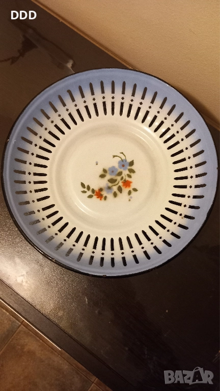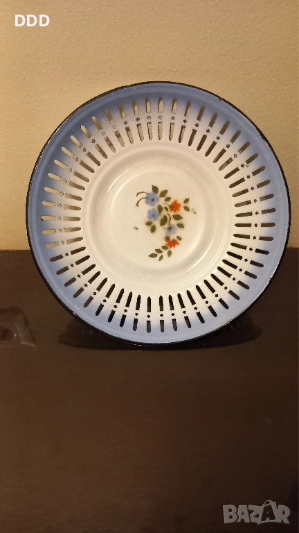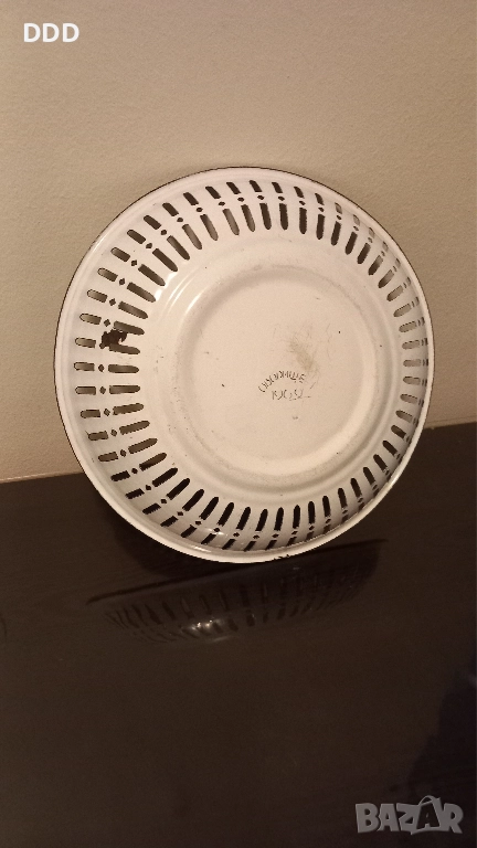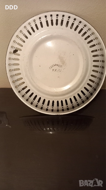 Емайлирана фруктиера, метална перфорирана от времето на соца с диаметър 25 см. и височина 5 см. състояние видно от снимките.