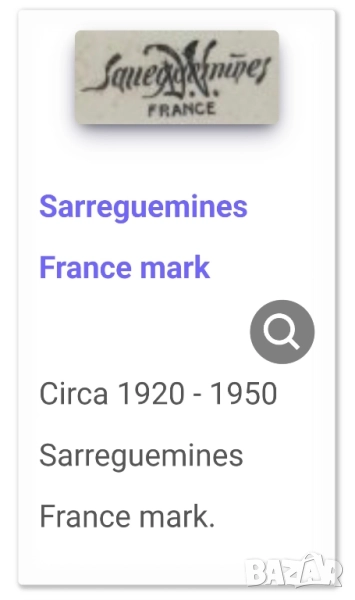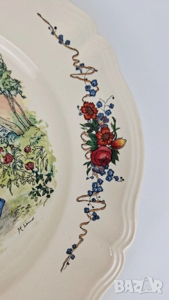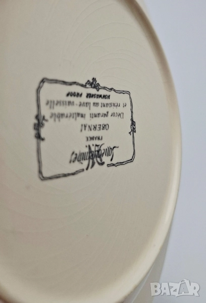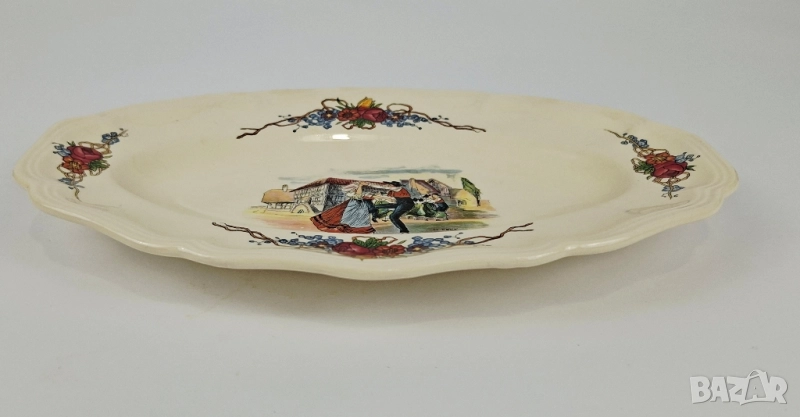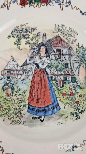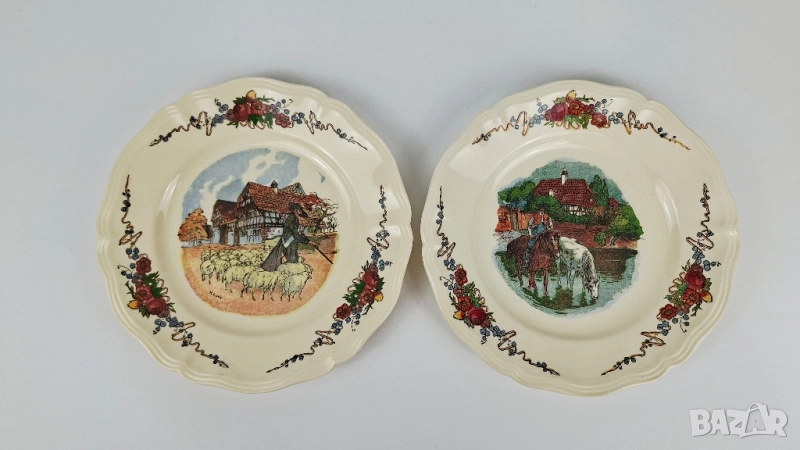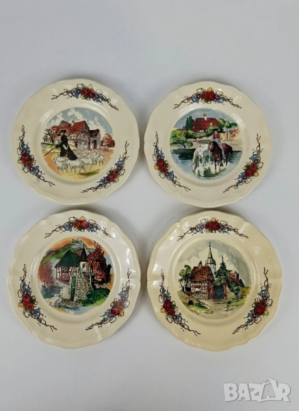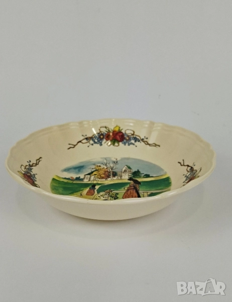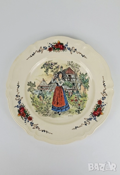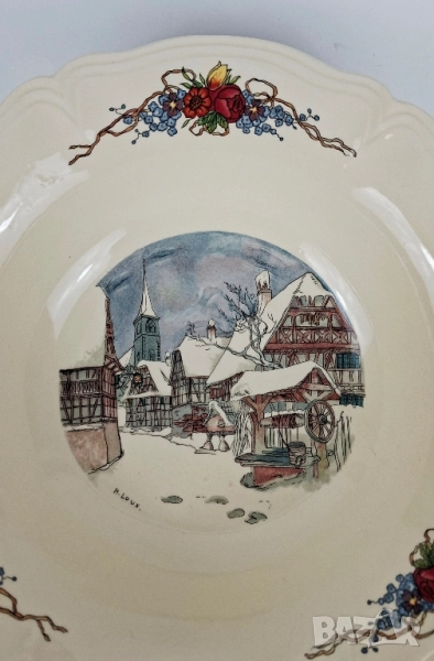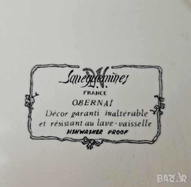 Елегантен винтидж сервиз от прочутата френска фабрика Sarreguemines, модел Obernai, изработен от фаянс. Отличава се с подглазурна декорация, изобразяваща живописни селски пейзажи и сцени от провинциалния живот. Всеки съд е оформен с релефен кант в традиционния за марката стил.