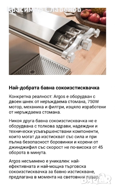 Argos несъмнено е уникален: най-ефективната и най-мощна търговска сокоизстисквачка за бавно изстискване, предлагана в момента на световния пазар.