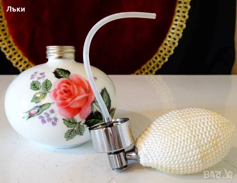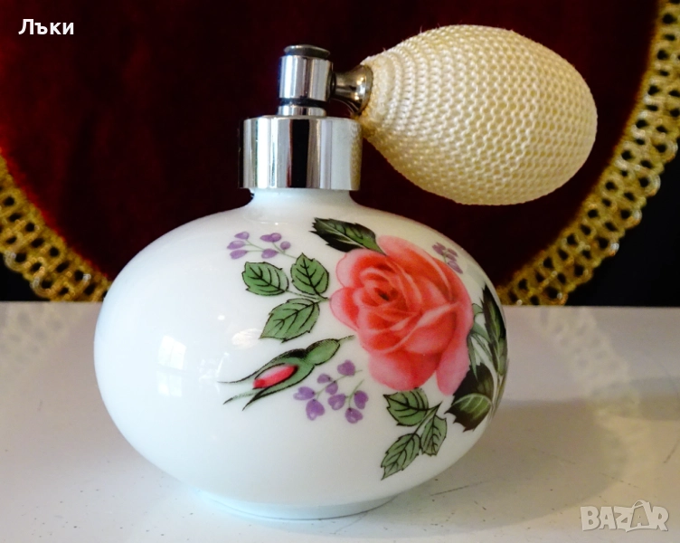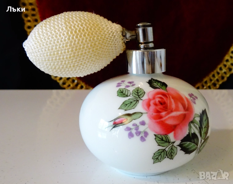 декорирана с красива роза върху снежно бял порцелан.Шишенцето не е