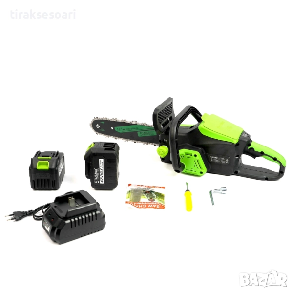 Комплектът включва 2 батерии по 10Ah, 2 вериги, зарядно и инструменти за сглобяване, така че можете да започнете работа веднага. Подходяща е за домашна и професионална употреба.