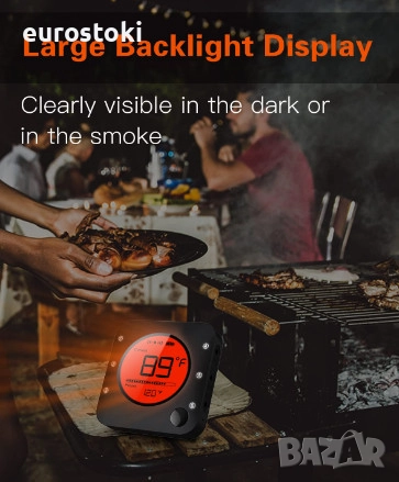 Голям LCD дисплей. Големият LCD екран и цифровият дисплей на барбекю термометъра могат да облекчат зрителната умора. Можете да прочетете много информация на екрана: сигнал за връзка, индикатор за захранване, текуща температура, целева температура, индикатор за напредък и т.н. Функцията за подсветка осигурява ясен дисплей на тъмно или опушено място. Дисплеят на Bluetooth термометъра ще превключва между температурите на всяка сонда на свой ред.