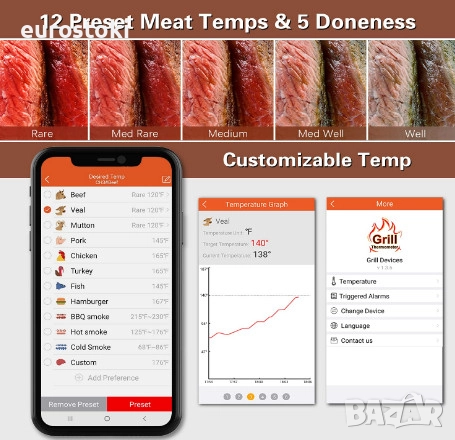 Високоточни показания. Bluetooth термометърът за месо измерва температури от 1 °C до 300 °C (33 °F до 572 °F) с точност от ±1,8 °F/1 °C, осигурявайки бързи и точни показания всеки път.