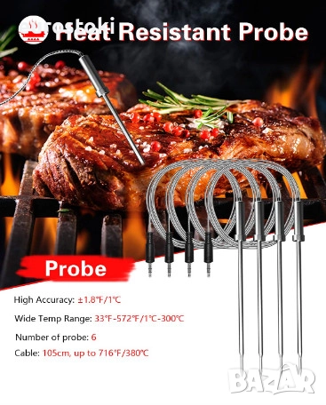 6-канални сонди. Безжичният термометър за грил се предлага с 6 сонди от неръждаема стомана за хранителни цели, които могат да следят до 6 различни храни едновременно, което може да задоволи вашия разнообразен план за готвене.