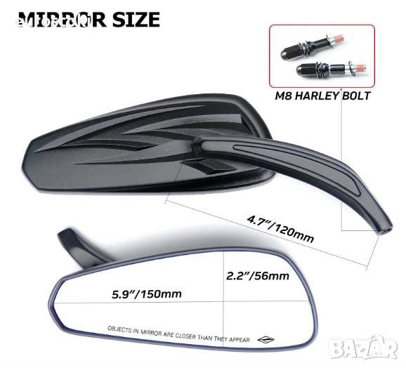 Мотоциклетни огледала за кормило 0,2 инча/8 мм. Диаметърът на винта на края на стъблото е M8. Съвместими са с Harley Davidson XL883C XL883N XL883L SPORTSTER FLSTC FXDB DYNA FXDF FLSTF XL1200L SPORTSTER XL1200C XR1200X XR1200 FLHT FLHR ROAD KING FLHYUC FLTRX.