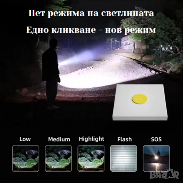 Режими: 5 режима (ниско, средно, високо, мигащо, SOS)