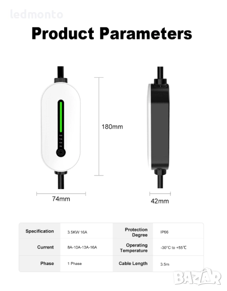 Висококачествено портативно зарядно устройство IPENGEN 16A 1Phase 3.5kW с 3.5m кабел и Wallbox станция, подходящо за зареждане на електрически автомобили у дома или в движение. Зарядното е налично в три модела според типа конектор към автомобила – Type1 (SAE J1772), Type2 (IEC 62196-2) и GB/T20234, като всеки модел е снабден с универсален Schuko щепсел за стандартен контакт. Устройството е 100% ново, осигурява бързо и безопасно зареждане, директна връзка без модификации и е устойчиво на атмосферни условия. Цената е за 1 брой според избрания модел.