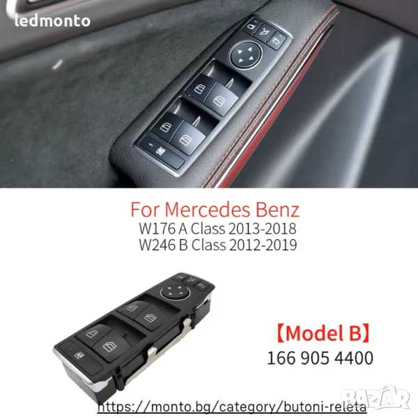 Висококачествени електрически бутони за прозорци (power window switch) за Mercedes-Benz W246 B-Class (B180/B200/B220/B250) и W176 A-Class (A180/A200), OE номер 1669054300. Предлагат се три модела: Model A – шофьорски панел с 7 бутона и джойстик, LED осветление; Model B – шофьорски панел с 8 бутона и джойстик, LED; Model C – пасажерски панел с 1 бутон. Всички бутони са 100% нови, изработени от устойчива пластмаса, осигуряват прецизен контрол и лесен монтаж без модификации. Проверете съвместимостта по VIN или снимки. Поръчайте от monto.bg с бърза доставка с Еконт, наложен платеж и преглед.