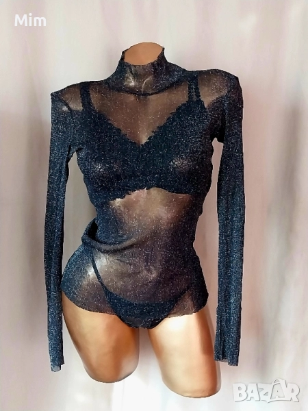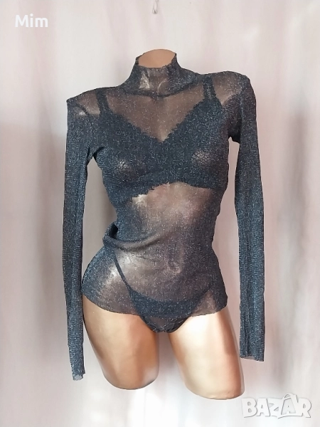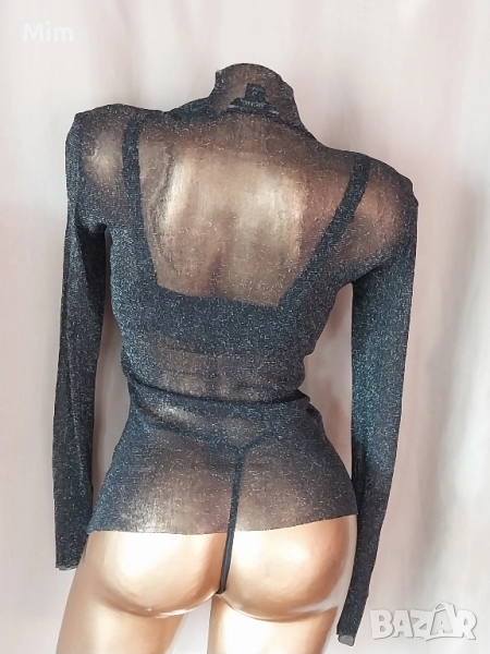 1-Черна еластична блуза с дълъг ръкав от сребрист брокат, гръдна 90 до 120 см ,дължина 60 см -цена 13 лв