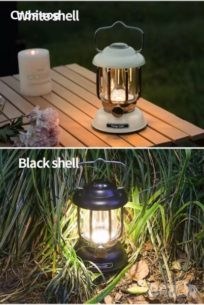USB презареждане. Мощност на максимален режим до 400 лумена, капацитет на батерията 6000 mah. Време за работа при максимална яркост е 10 часа. Ако се ползва на по нисък режим на осветеност издържа повече от 16 часа постоянно светене. Налични бял, зелен и черен цвят. Метален корпус и качествена изработка. Бутон с потенциометър за плавно регулиране на мощността. Ретро стил и функционалност. Няма нужда от батерии, просто презаредете лампата с USB кабел type-c.
