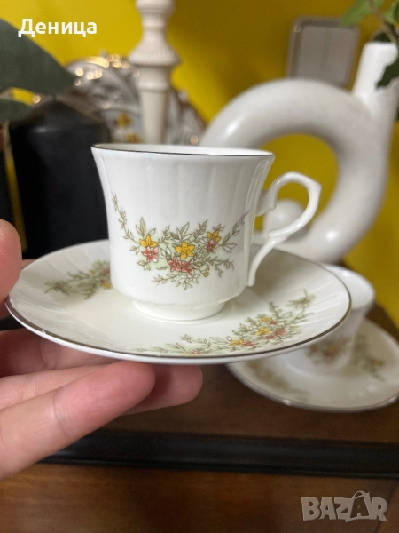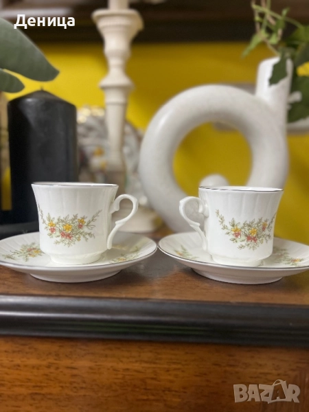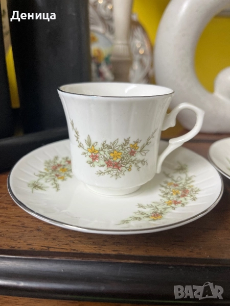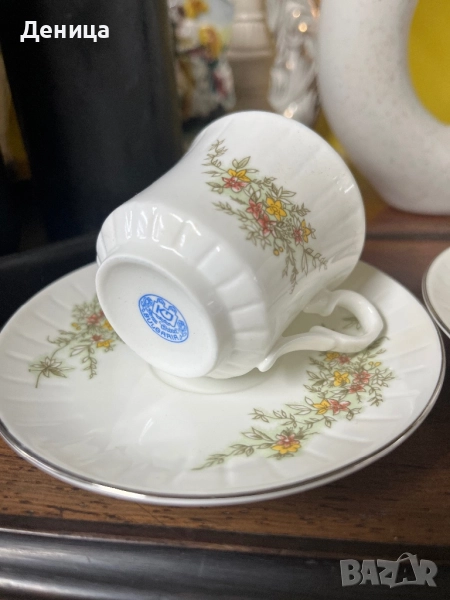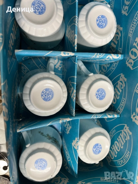 Видински костен порцелан За късо кафенце—90 мл 6 сета в оригинална кутия, сребърен кант → Обява 52150786