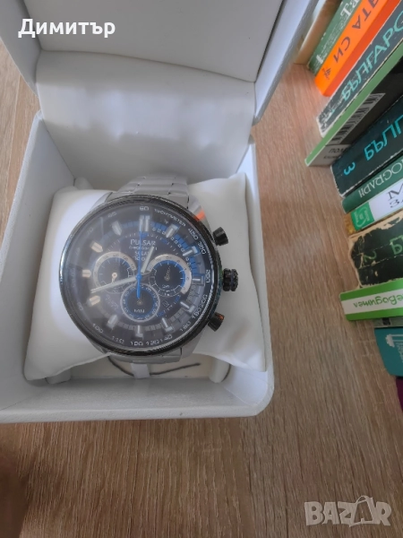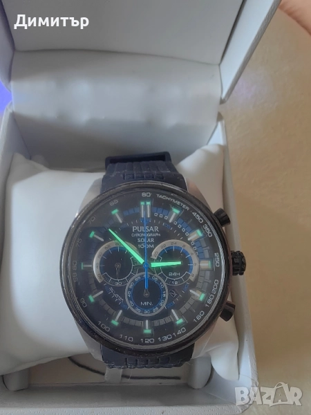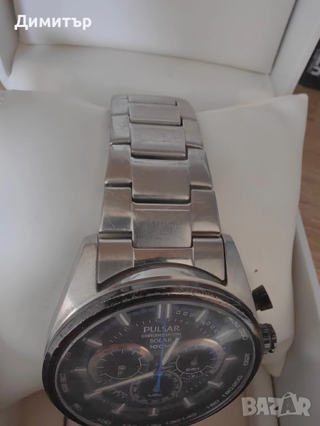 Продавам мъжки часовник Pulsar със соларен, кварцов механизъм на Seiko VS75.Батерията се зарежда от слънчева клетка. По желание мога да измерят автономията, която в момента е проверено повече от 96 часа. Водонепроницаемост до 100м.