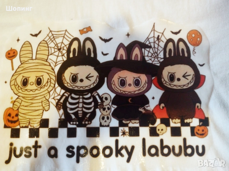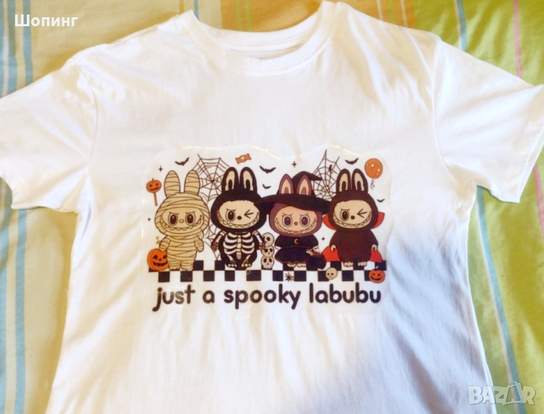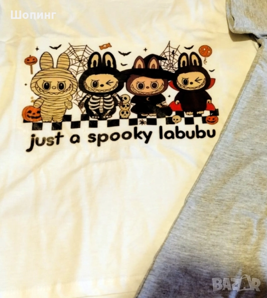 Чисто ново! Комплект Лабубу включва тениска - размер 146, за около 11 год. възраст, обиколка гърди около 90 см, дължина 54 см. Памучна, бяла с Лабубу принт с надпис.