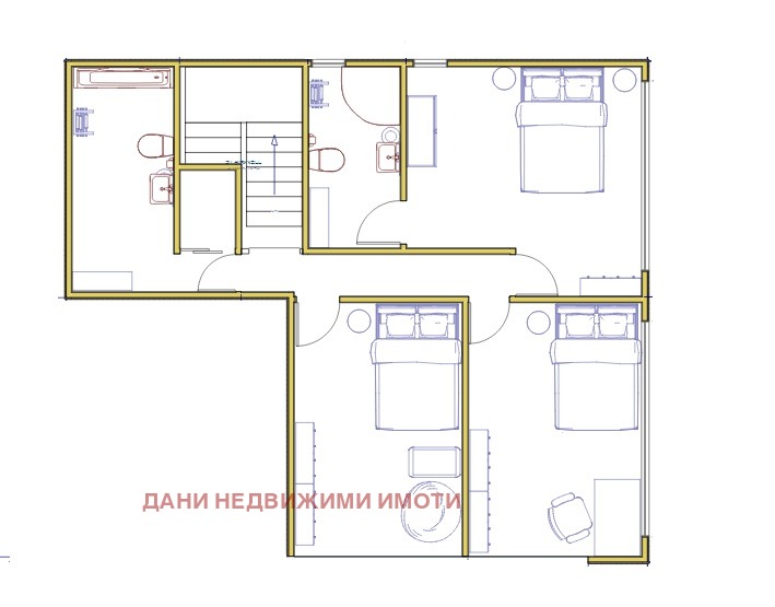 Второ ниво: три спални, две бани с тоалетна, перално помещение.