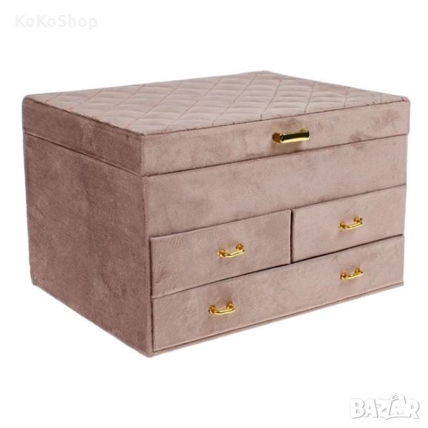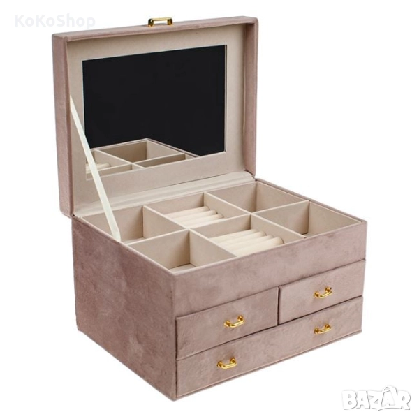 Луксозна кутия за бижута с кадифено покритие. На капака има голямо огледало,а разпределението на различните сектори е много удобно,за съхранение на пръстени,гривни,малки и големи колиета.