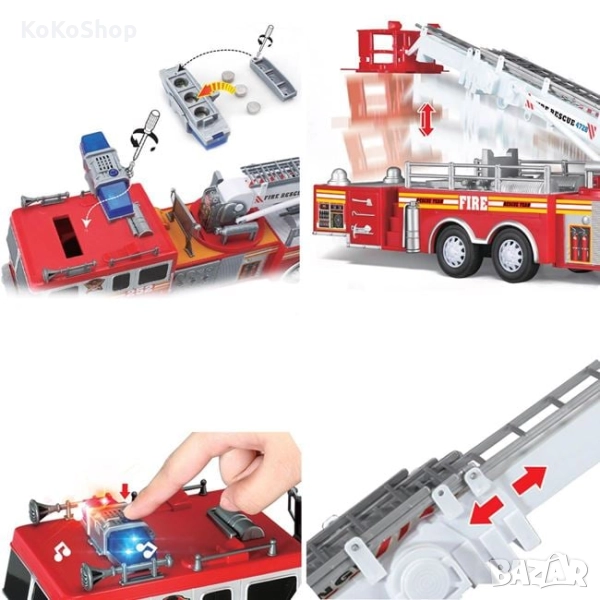 Реалистична детска пожарна кола,която е дълга цели 60 см. Пожарната е снабдена с телескопична стълба,кош за спасяване на хора и сирена с автентични звуци и светлини.