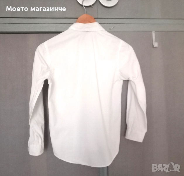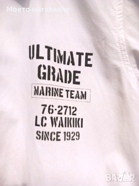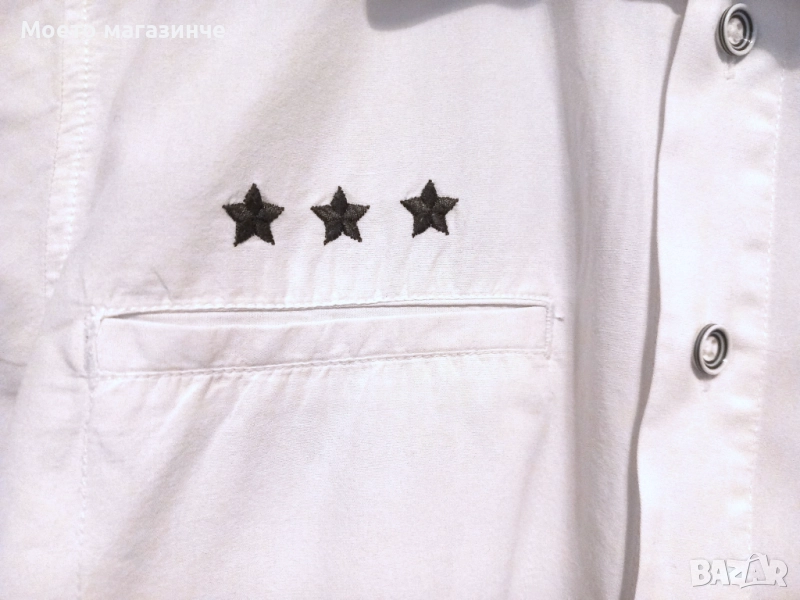 Стилна бяла риза LC Waikiki с военноморски дизайн и оригинални детайли – бродирани звездички и надписи отпред. Подходяща е както за по-официални поводи, така и за училище или ежедневието. Материята е приятна, мека и удобна за носене. Носена е малко, без никакви забележки – в отлично състояние.