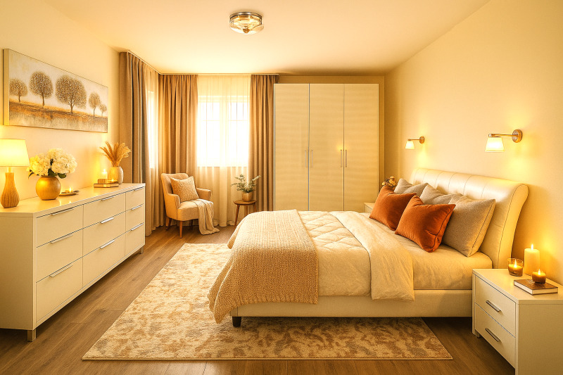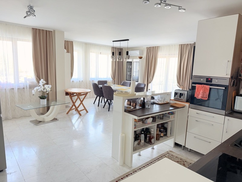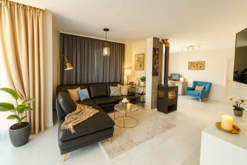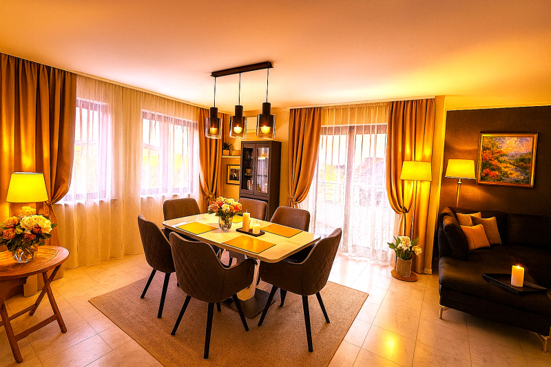 Интериорът е изпълнен по индивидуален дизайнерски проект с нови луксозни мебели и висококачествени естествени материали, които създават атмосфера на комфорт и изисканост: