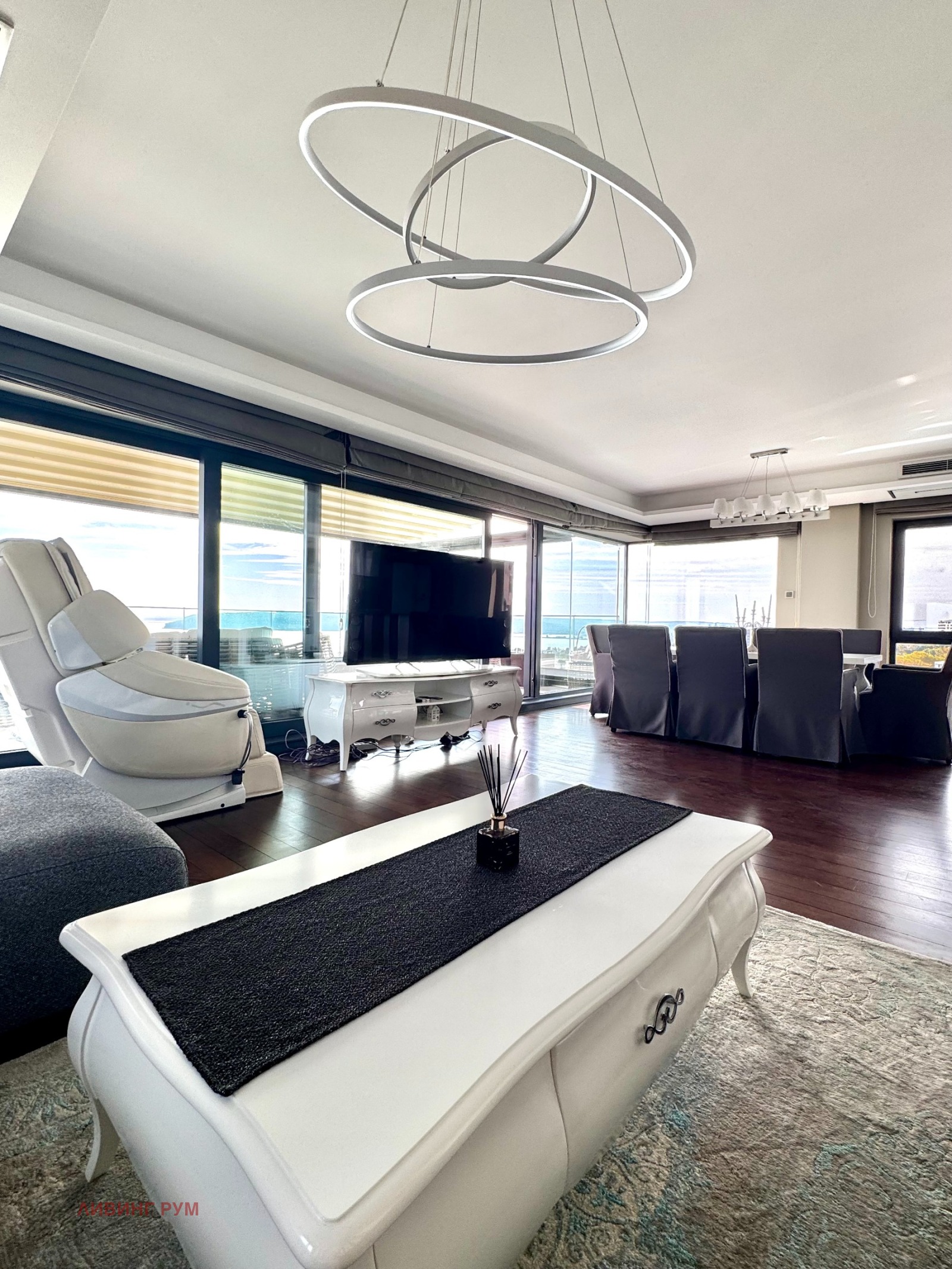 коридор с вграден гардероб, три спални, една от които със самостоятелна баня и дрешник, просторен дневен тракт с кухненска част и трапезария с излаз на просторна /50 кв.м./ тераса с изглед към морето и града. Жилището разполага с още два балкона и сервизно помещение.