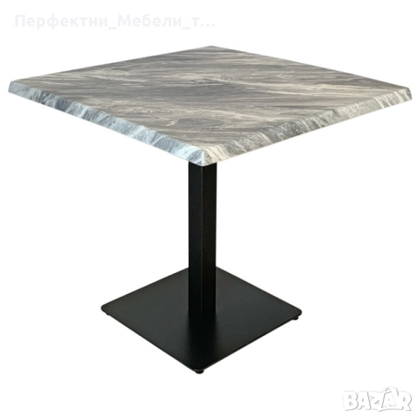 Подходяща е за вътрешно и външно обзавеждане. Основата е с размер 45/45 см. Плота на масата е верзалит с размер 80/80см. Височина на масата -75h. Верзалитовите плотове се изработват по специална технология и термична обработка на дървени частици, смоли и меламин. Това е уникален продукт, които издържа на различни атмосферни условия- влага, слънце, температура до 180 градуса и повърхностно износване.