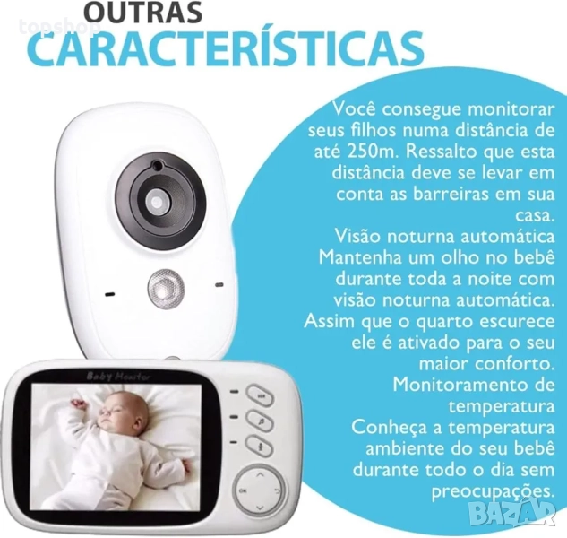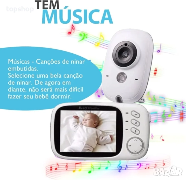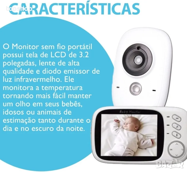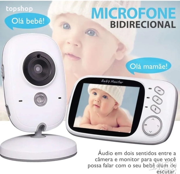 ОПИСАНИЕ: VB603 Бебешки монитор. Комплект за наблюдение с електронно нощно виждане, лесно и практично преносимо наблюдение. Двупосочно аудио между камерата и монитора, можете да говорите с бебето, да знаете температурата в стаята на вашето бебе през целия ден, без притеснения. Приспивни песнички за спомен, помагат на бебето да се успокои и да заспи. Характеристики: