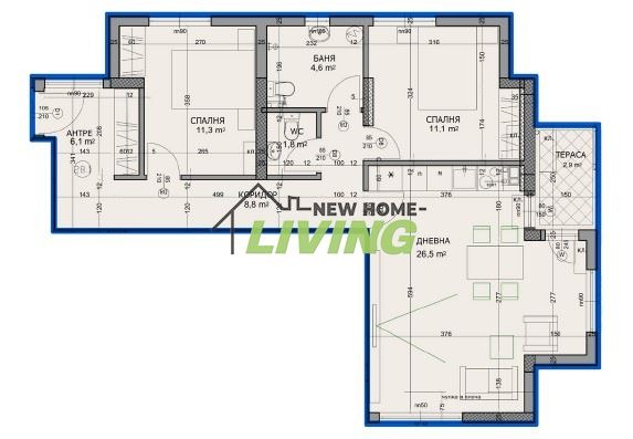 Разпределение: хол с кухненски кът и трапезария, две спални, две бани с тоалетни, входно антре, тераса и избено помещение.