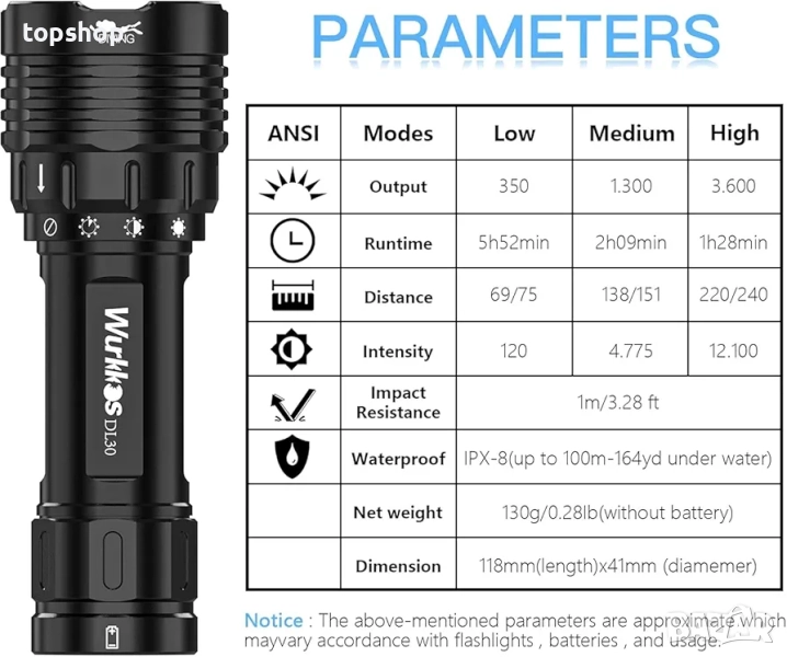 Високо качество - Корпусът на водолазния фенер е изработен от висококачествена авиационна алуминиева сплав 6061, с удебелен закален стъклен връх и оксидирано износоустойчиво покритие. Той е водоустойчив, удароустойчив и износоустойчив, издържал е тест за водно налягане от 100 метра.