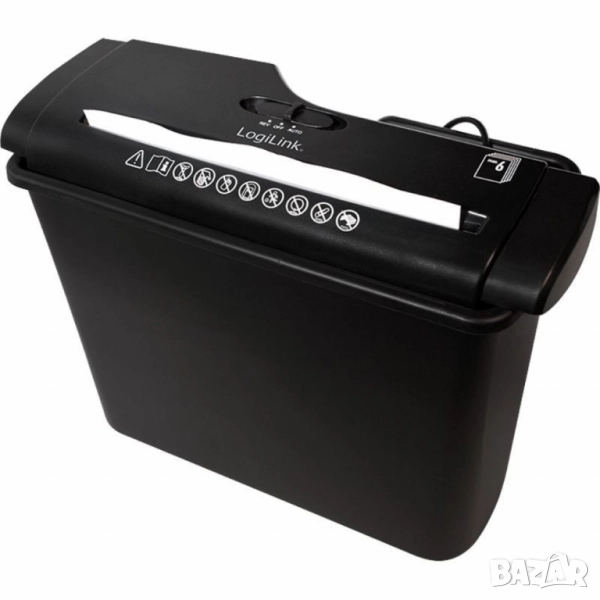 шредер за документи LogiLink унищожава хартия с ленти с ширина 6 мм. Това позволява едновременна обработка на до шест листа A4. Ширината на подаване може да се регулира индивидуално. Устройството може да се настрои на удобен автоматичен режим и разполага с безопасно изключване в случай на прегряване. До 6 листа наведнъж, разрез 6 мм.; Контейнер (кош) за отпадъци: 7 литра. Входна ширина до: Около 220 мм (A4); Цвят: Черен; Размери на продукта: 316 × 305 × 137 мм (ширина × дълбочина × височина); Тегло: 1,26 кг.; Гаранция: 12 месеца.