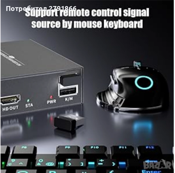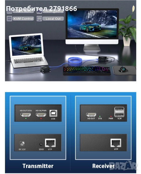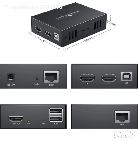 - USB и KVM: От страната на приемника може да се свърже мишка и клавиатура за управление на отдалечения компютър от страната на предавателя.