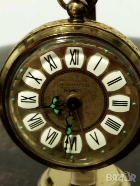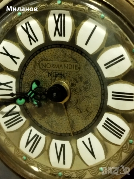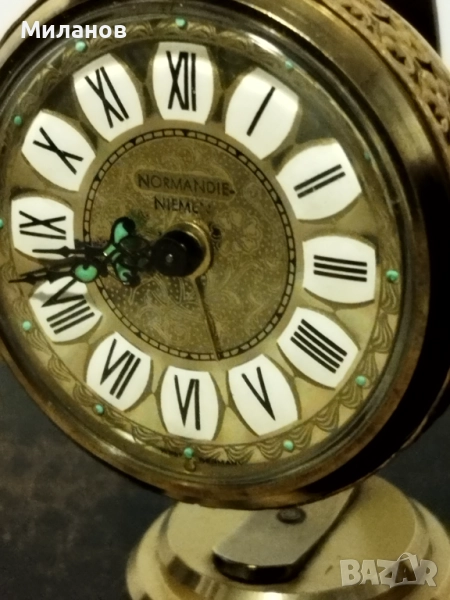 Стар малък френски будилник Normandie, отремонтиран и смазан.Работи и звъни.Диаметър-59 милиметра, комплект със стойката.Месингов.Номер на часовника-126260