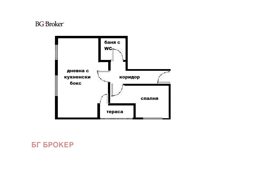 Г-образен коридор, дневна с кухненски бокс, спалня, баня с тоалетна и тераса с излаз от дневната.