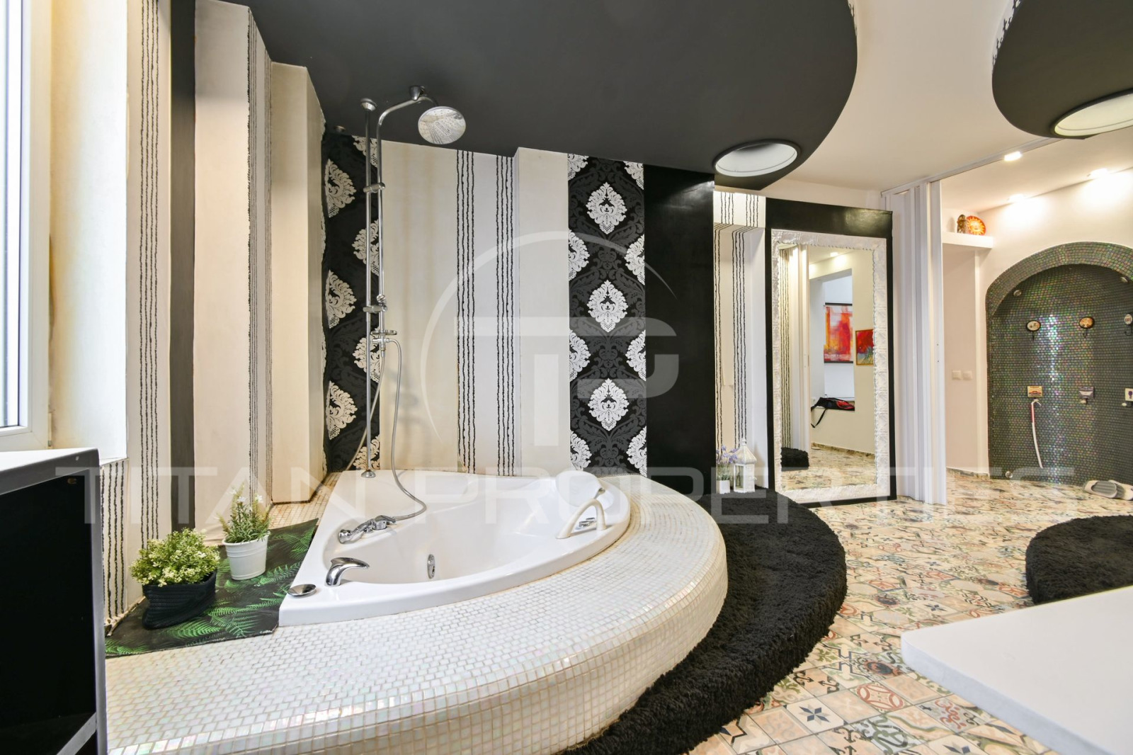 Разпределението включва три спални, голям вестибюл, просторна кухня, хол, отделна трапезария, голяма баня с джакузи, балкон и мазе. Обзаведен с изискан интериор имотът дава възможността за продължение на действащ бизнес - отдава се през RBNB за краткосрочен наем в луксозния сегмент. Отопление е на електричество. Луксозното изпълнение подчертава съвременния характер на жилището и предлага комфортно и стилно решение в сърцето на града.