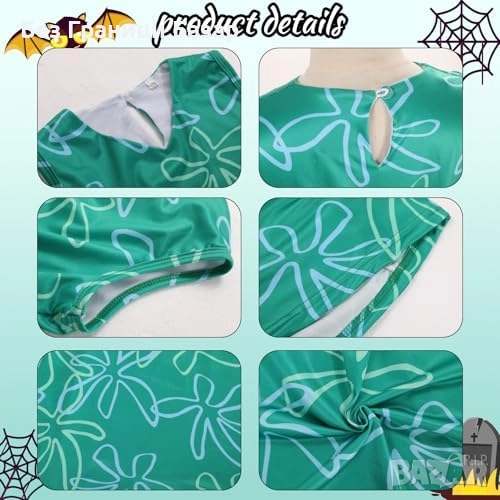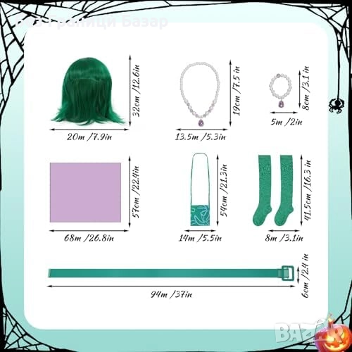 Включва зелена рокля, перука, чанта, чорапи, бижута и мрежички за коса