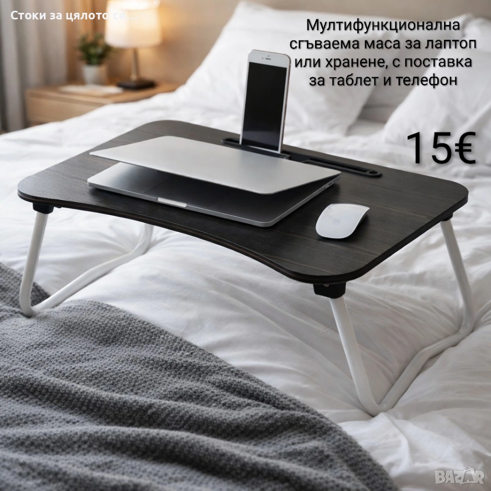 Сгъваема маса за лаптоп или хранене, с поставка за таблет и телефон
