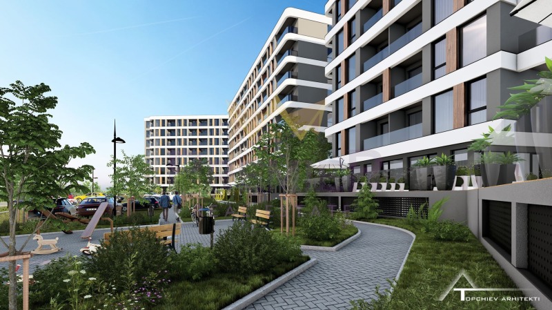 Вътрешния двор на сградата ще е максимално облагороден - пешеходни пътеки, озеленяване, детска площадка.