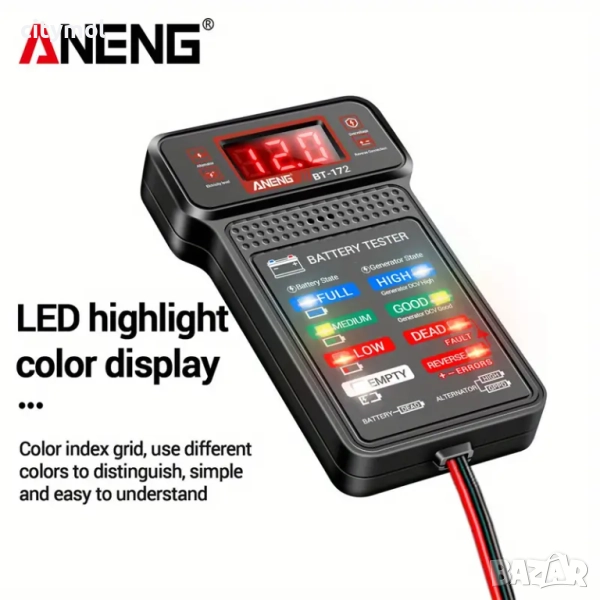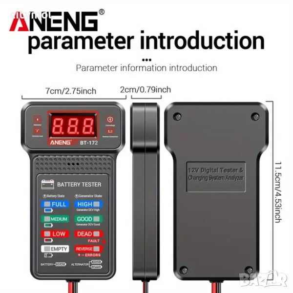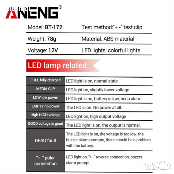 Тестерът за автомобилни акумулатори ANENG BT172 е надежден, преносим и многофункционален тестер за акумулатори. Използвайки този тестер, потребителите могат лесно да разберат работното състояние на батерията и да извършват навременна поддръжка, за да осигурят нормалната употреба на автомобила.