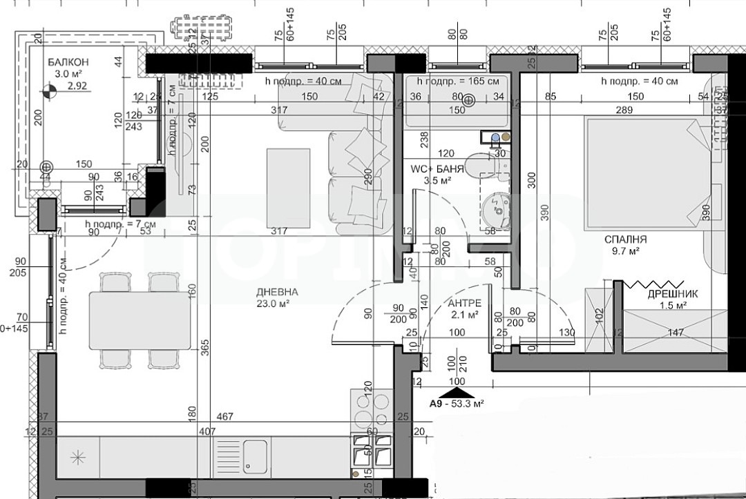 Имотът, който Ви представяме е разположен на втори етаж, с югозападно изложение и следното разпределение: антре, всекидневна с кухненски бокс 23 кв.м. с излаз на балкон 3 кв.м., спалня с дрешник 11.20 кв.м., санитарен възел.