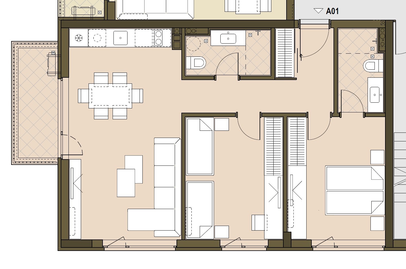 АПАРТАМЕНТ А01 - ЗП - 84,36 кв.м.; ОЗП - 99,60 кв.м.; Изложение: ЮГ