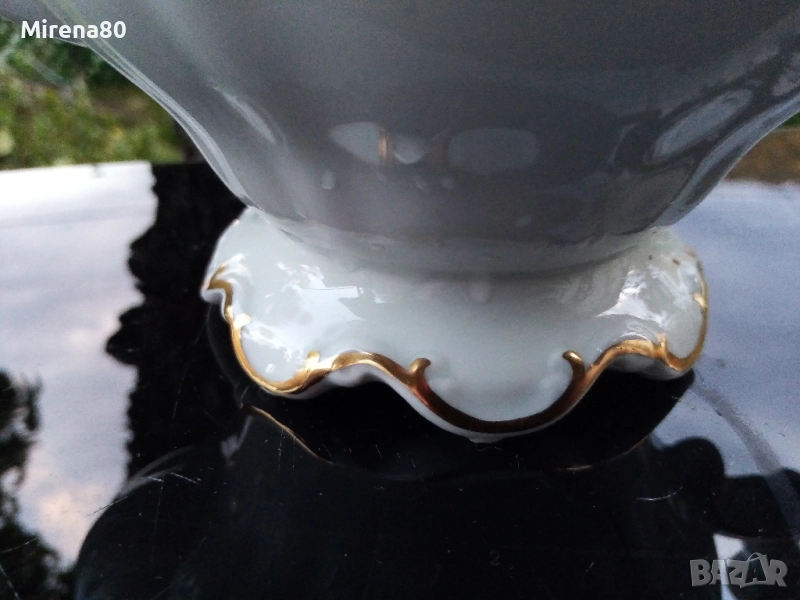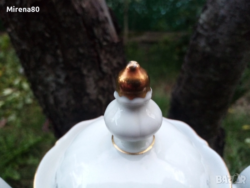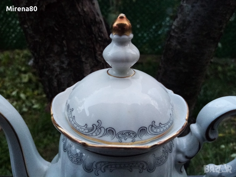 Чайникът е бароков екземпляр с невероятни форми и извивки, с плътен златен кант и сива "дантела". Все едно излязъл от някоя приказка, достоен и за кралска трапеза ! Вис. 22 см, отлично състояние - с минимално изтриване на златото на дръжката, но предвид факта, че е преживял една война - му е простено. Маркировка за произход - произведен между 1925 и 1939 г.