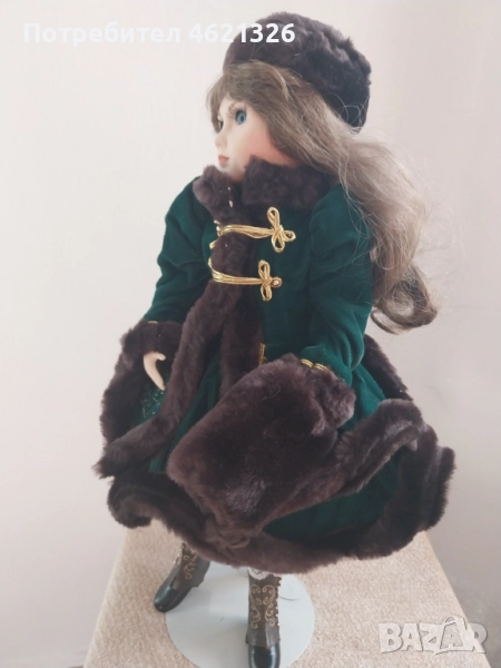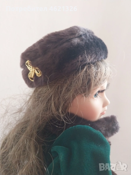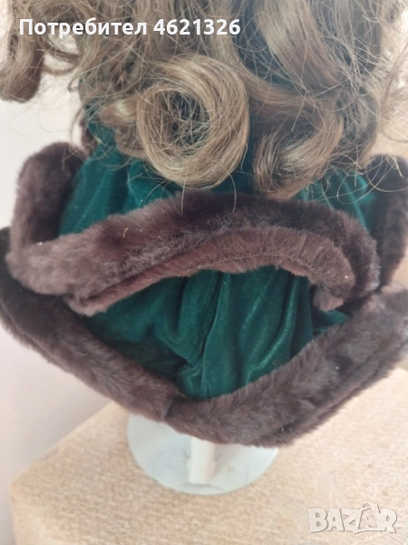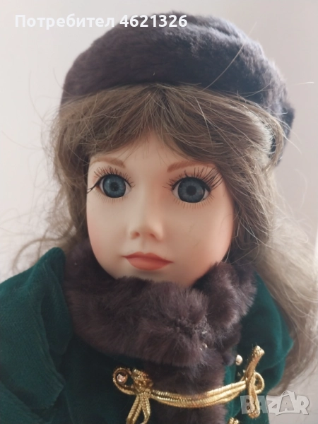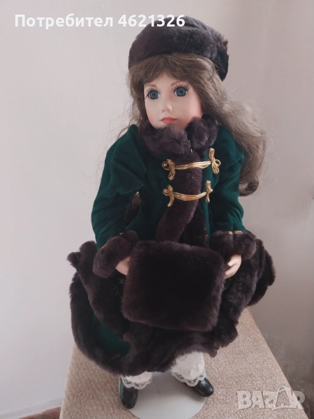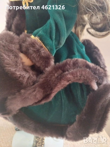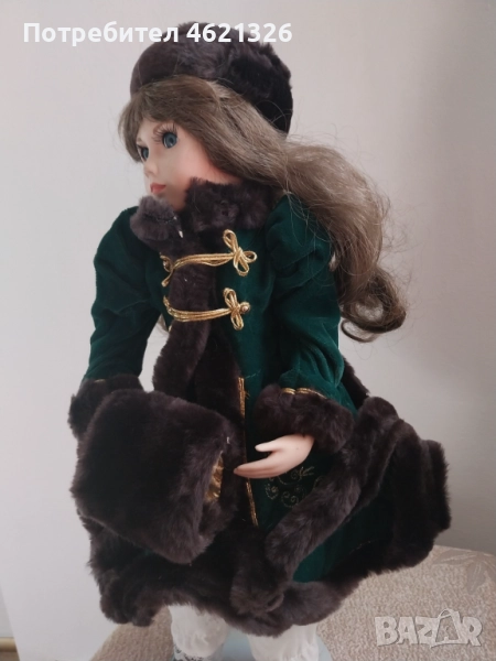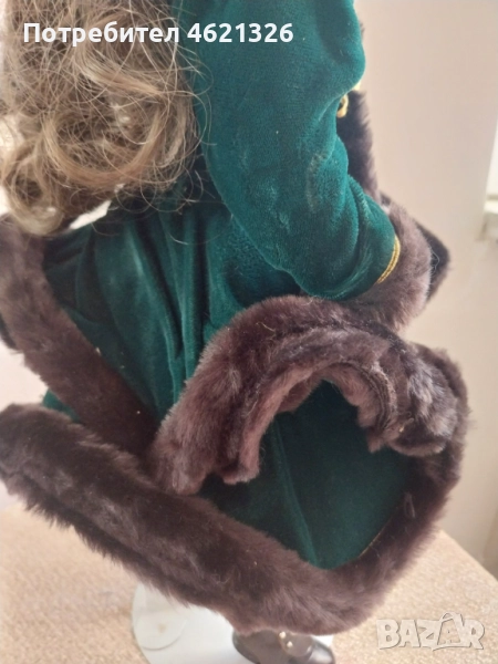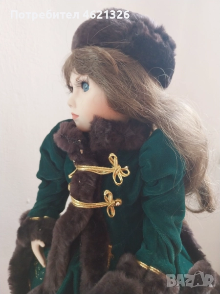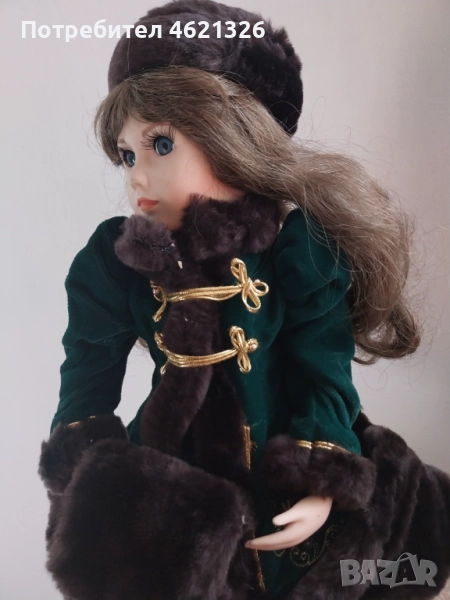 Представям ви зимна винтидж порцеланова кукла, облечена в елегантно зелено палто от кадифе, украсено с кафява кожа, с маншон. Палтото се допълва от кожена шапка с дискретна украса. Ботите са ръчна изработка със златен шев. Вълниста кестенява коса се спуска по гърба и допълва изваян силует. Куклата загатва класическата зимна елегантност.