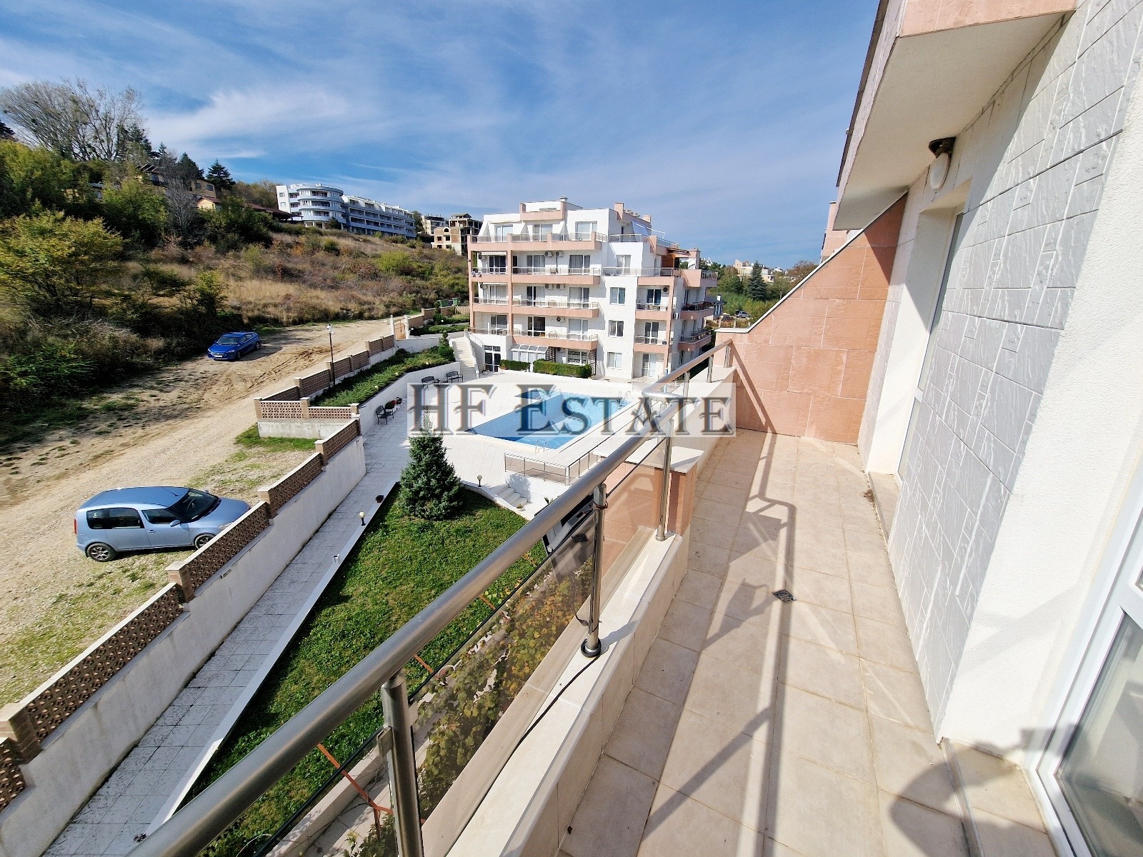 От прозорците на апартамента и от терасата се открива гледка към вътрешната територия на комплекса с басейн и изобилие от зеленина.