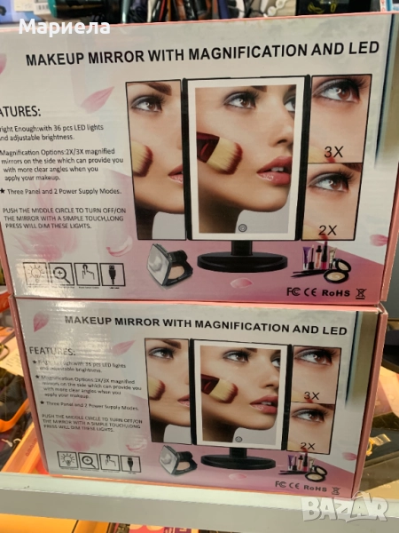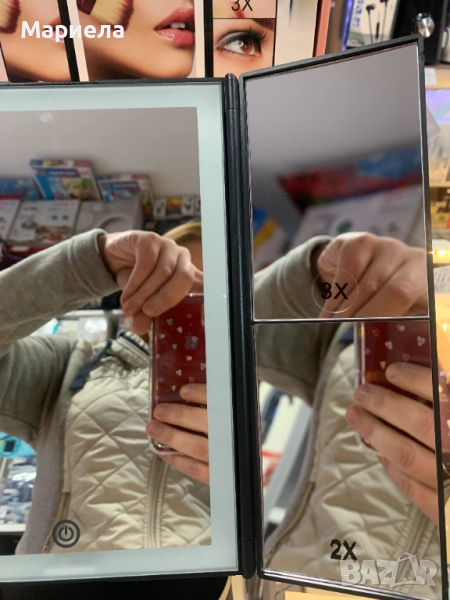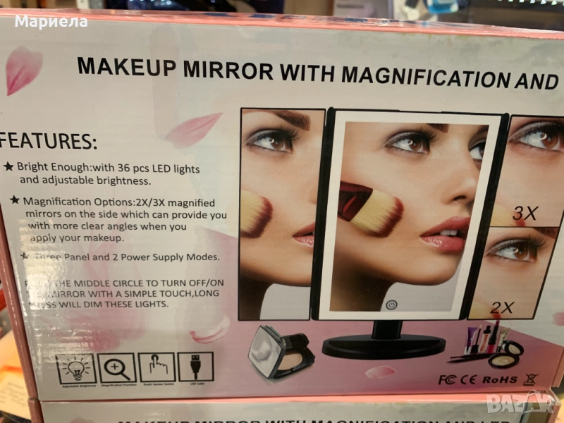 козметично огледало е оборудвано с 1X/2X/3X увеличително огледало. Уверете се, че всеки детайл от косата и грима ви е обмислен с удобната функция за увеличение. С управлението можете да включвате/изключвате светлината с кратко натискане и да регулирате яркостта с продължително натискане.