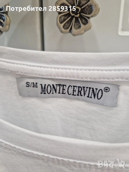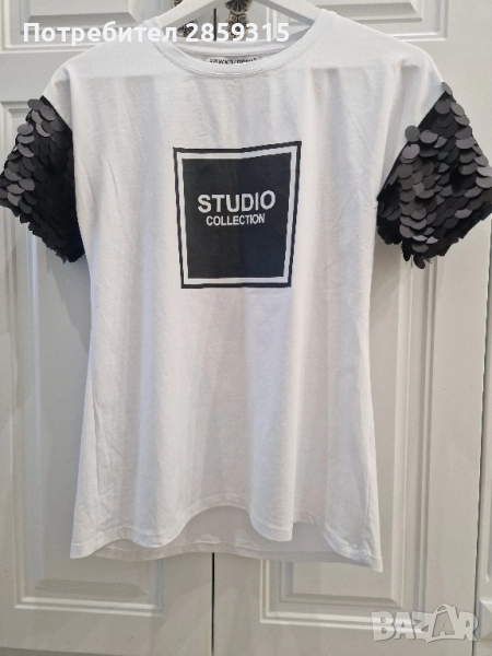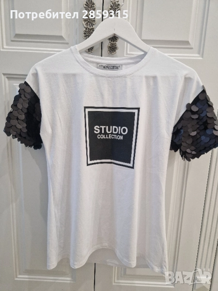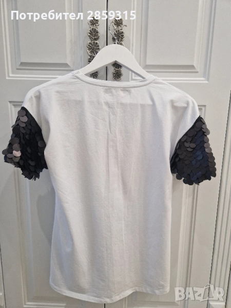 Дамска тениска - бяла с черни пришити пайети на ръкавите. Много интересен модел. Размер - S/M. Отговаря си на двата размера, леко е издължена отзад. Чисто нова, със свалени етикети, но не е прана и не е носена.