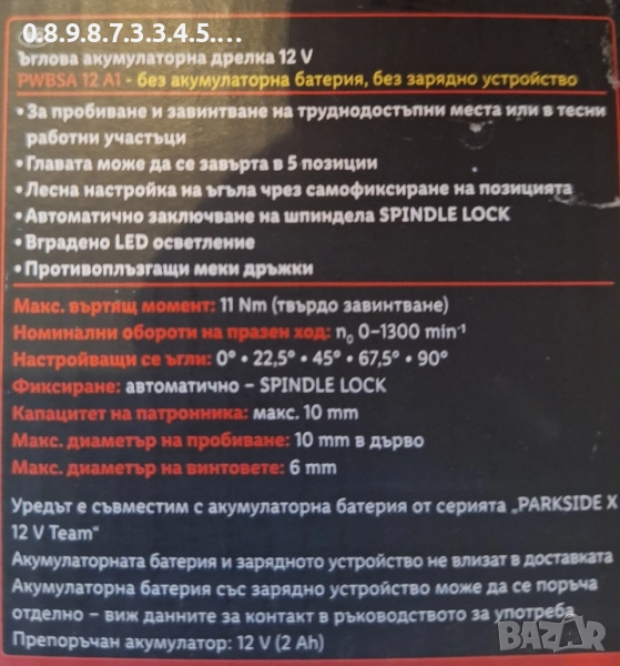 ъглова акумулаторна бормашина 12В на Парксайд Parkside model PWBSA 12V A1 → Обява 52156073