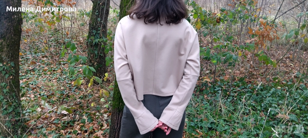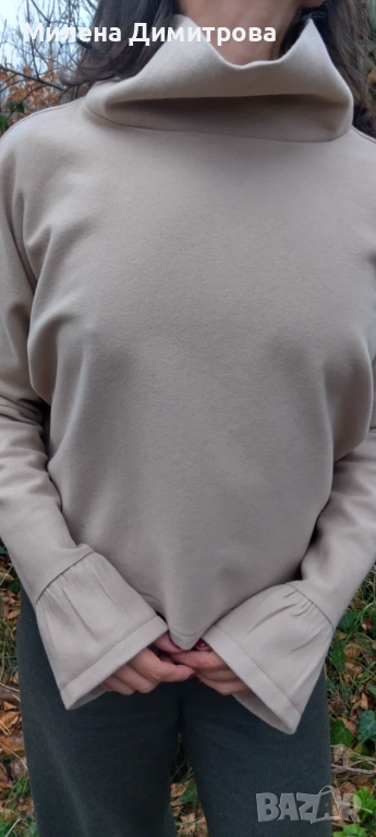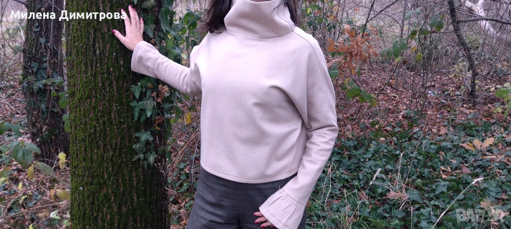 * С висока яка, широка и къса кройка и удължени ръкави с волани